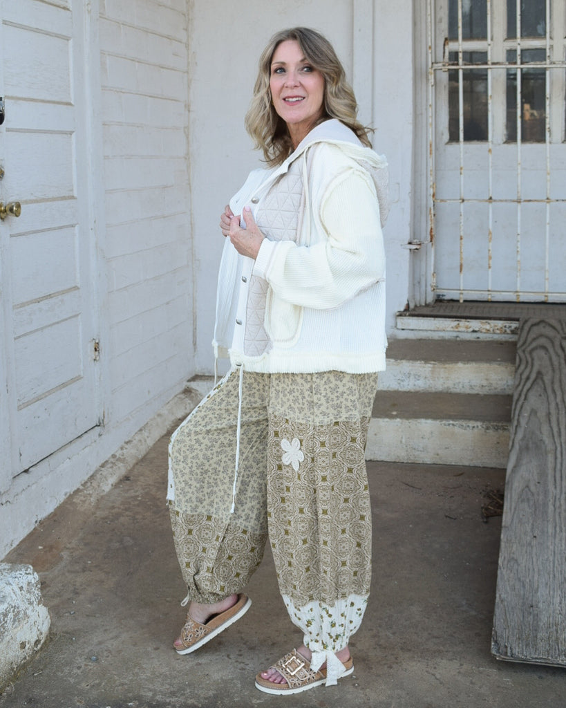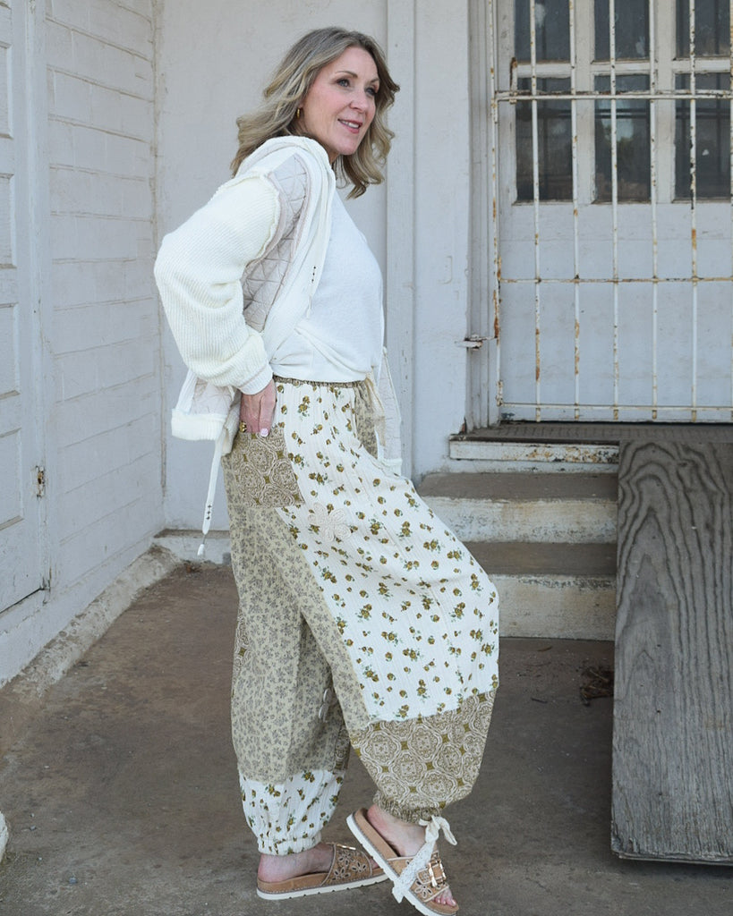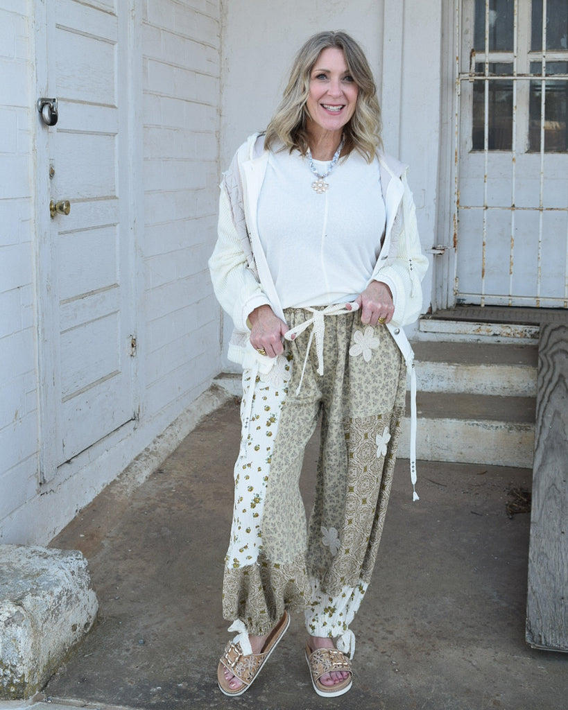 Step into vibrant comfort with the OH MY FLOWERS PANT BY POL - SAND MULTI. These roomy fit bottoms feature a lively printed woven fabric accented by playful contrast patchwork and charming crochet patch details, perfect for adding a splash of fun and flair to your day.