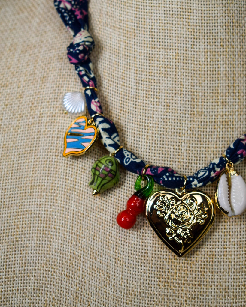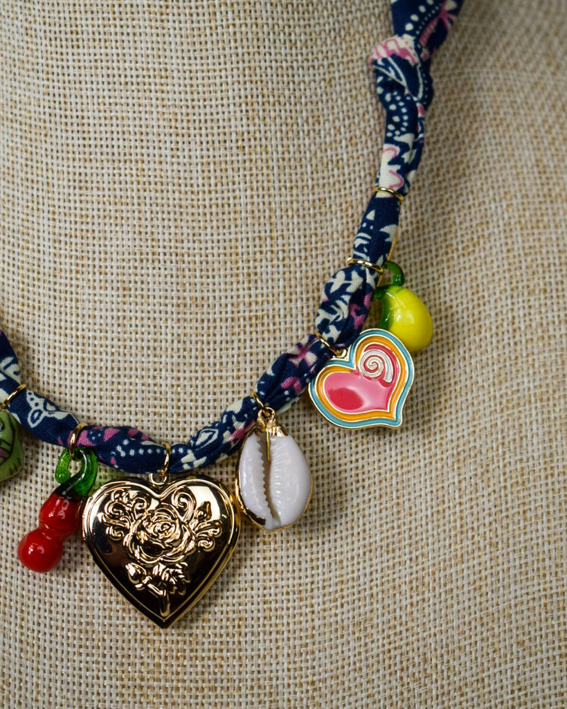 Add a splash of whimsy to your look with this playful navy scarf charm necklace. Featuring a charming heart locket, glass lemon and cherry charms, a delicate feather, vibrant enamel hearts, a shell, and a fish charm, it’s a fun way to express your unique style. Perfect for layering or wearing solo, this necklace brings a lighthearted vibe to any outfit.