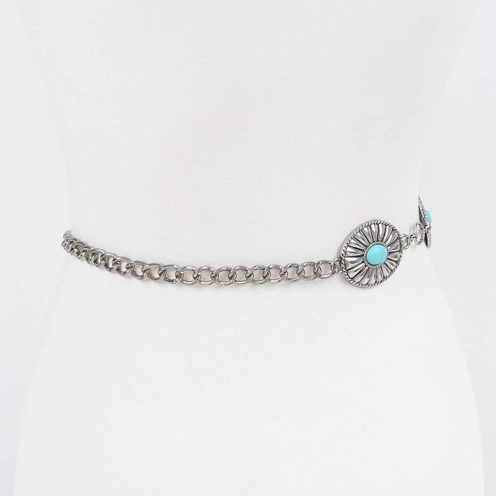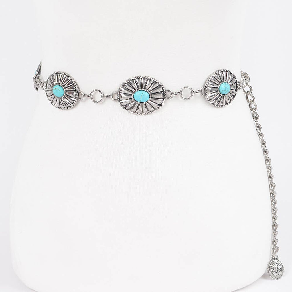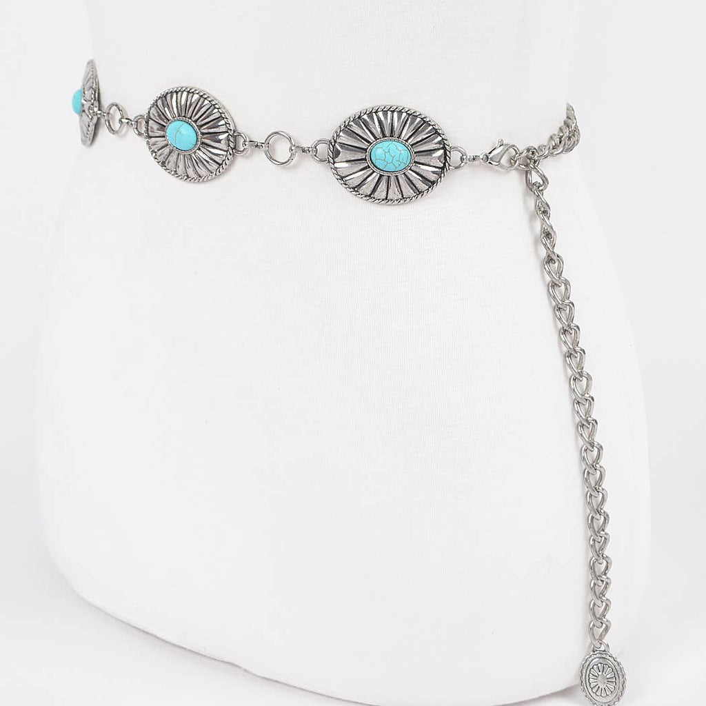- Features: Chain Concho Belt, Faux Turquoise detail, Adjustable