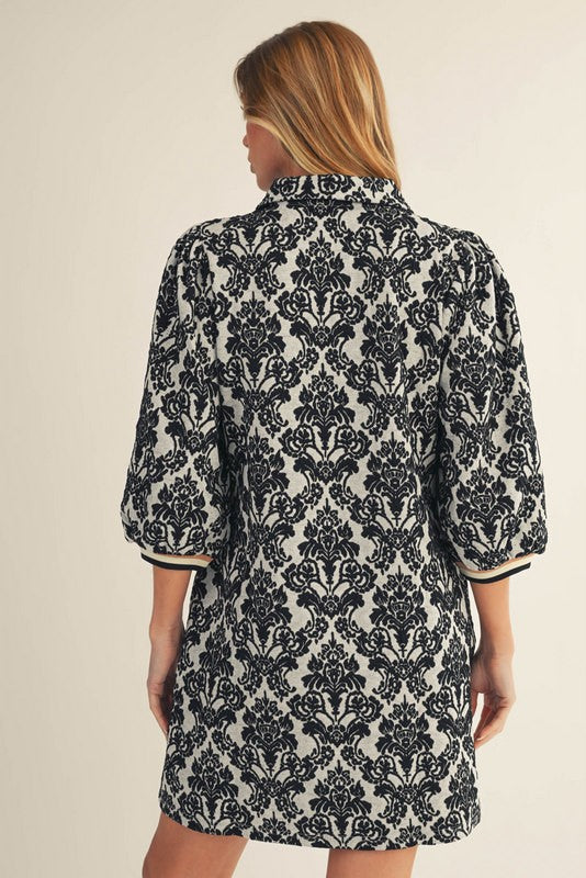 This boho textured shift dress in classic black and white blends carefree charm with subtle sophistication. Featuring a detailed collar that adds a touch of whimsy, it’s perfect for effortless style on any day. The light texture gives it movement and personality, making it a playful go-to for casual outings or easygoing evenings.