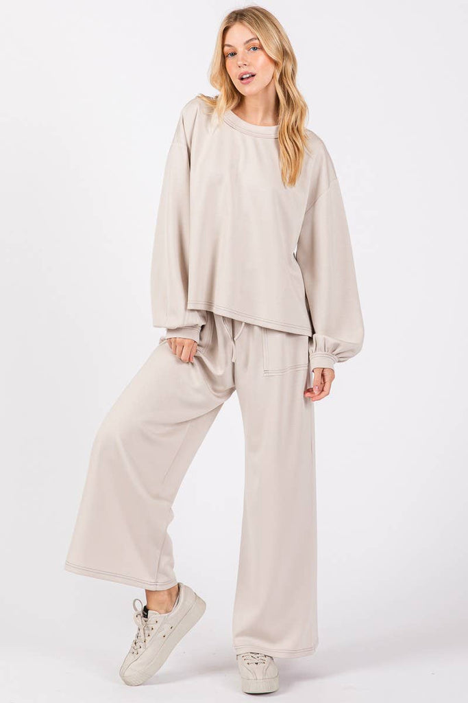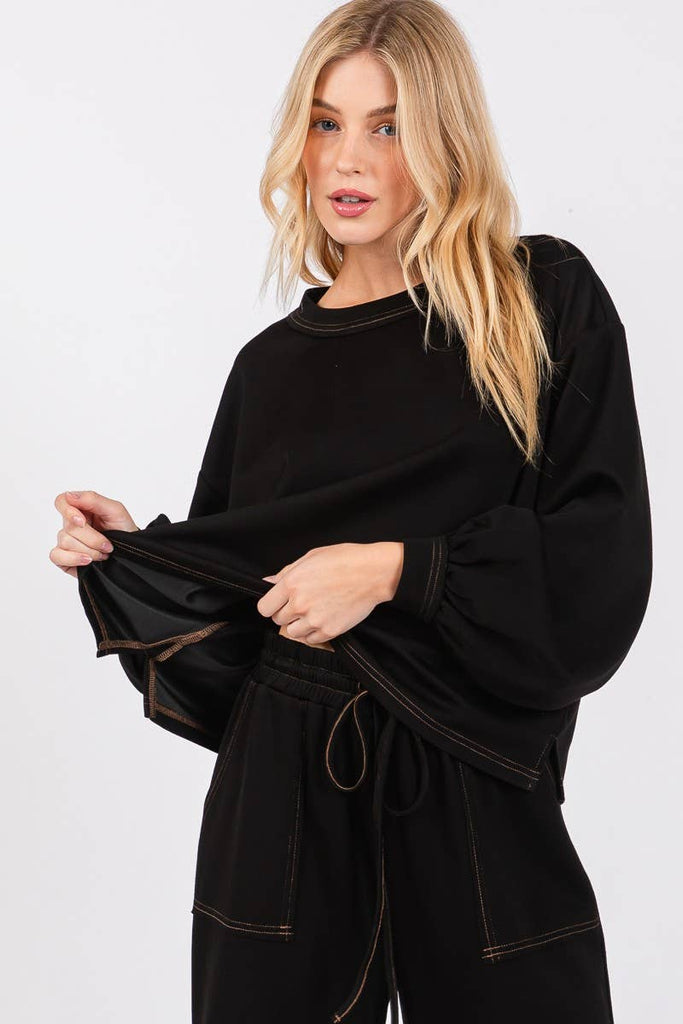 - Features: Super soft comfy scuba fabric. Top: Crewneck, Long sleeve, Gathered cuff, Boxy straight hemline. Pant: Elastic waist, pockets.