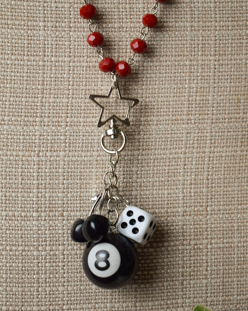 Channel your inner lucky charm with this playful Eight Ball Necklace in striking red. This fun piece features a classic eight ball charm paired with a dice charm and black cherry accent, all strung together with a vibrant red bead. Perfect for adding a touch of retro cool and whimsical energy to any outfit. Whether you're a game night enthusiast or just love bold, quirky jewelry, this necklace brings personality and a hint of fortune-telling flair to your everyday style.