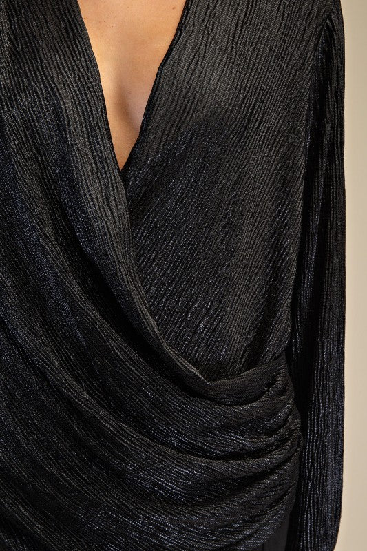 - Features: Crossed front, Side ruching, Metallic thread fabric, Long sleeve.