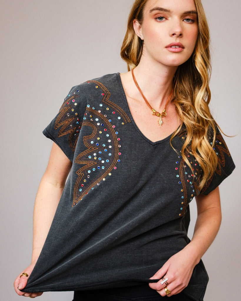 - Features: V-neckline, Garment washed knit, Embroidery stitching, Colorful gems.