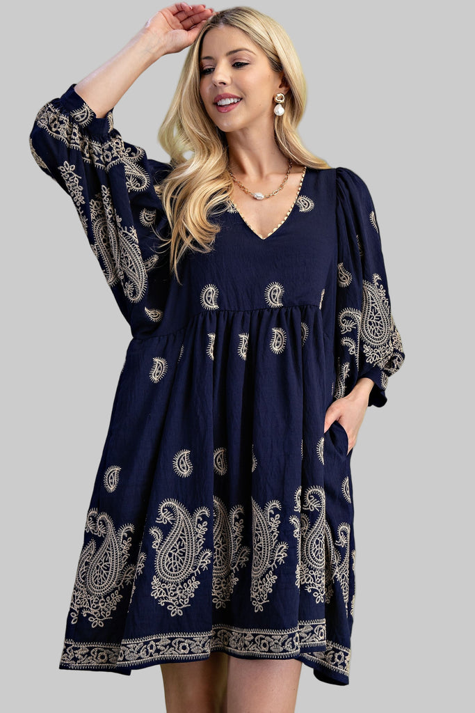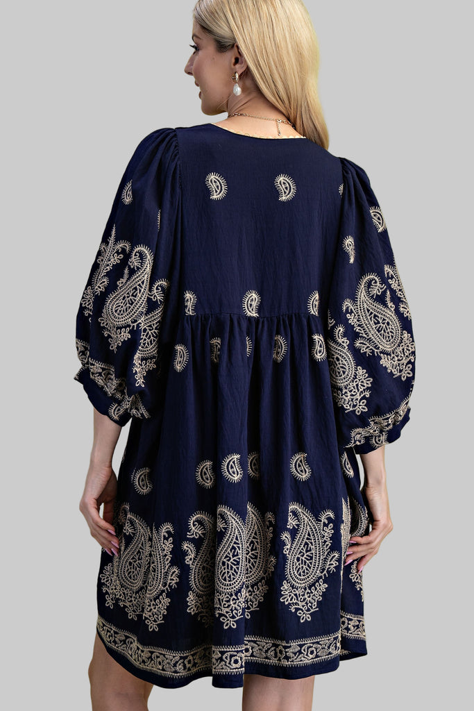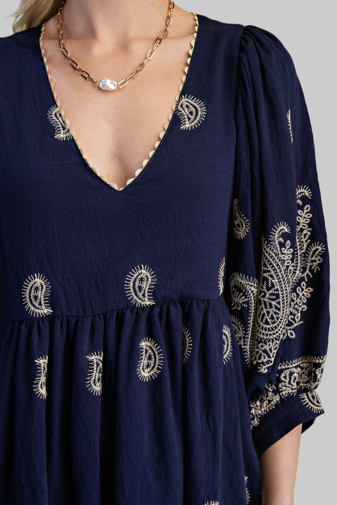 PAISLEY EMBROIDERED MINI DRESS - NAVY