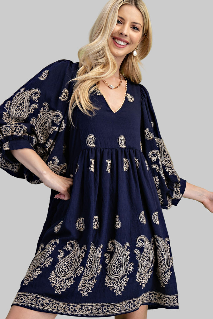 Twirl into the season in this navy mini dress that's giving major vintage vibes! Delicate paisley embroidery adorns the bodice, while charming puff sleeves add that perfect touch of whimsy. The flowy silhouette is ideal for everything from brunch dates to evening adventures. Pair it with your favorite boots or sandals and watch heads turn. This dress is your new go-to for effortless style that feels anything but basic.