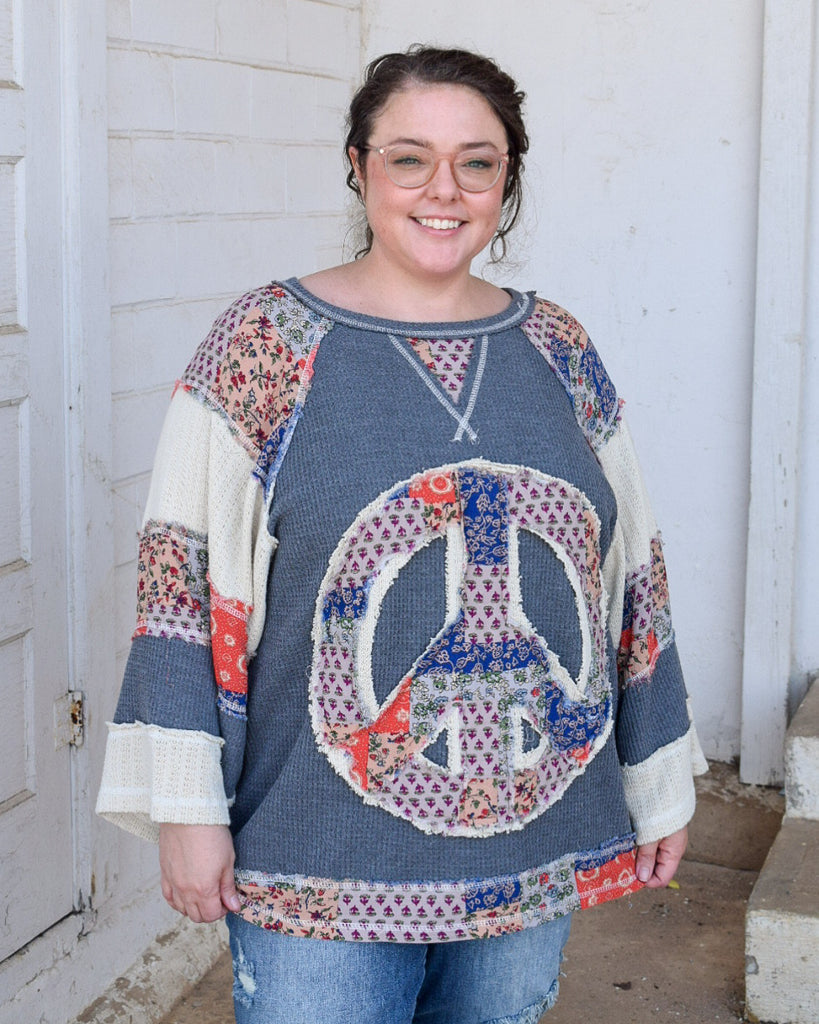 Embrace your free spirit with the Peace Sign Patchwork Top by POL in charcoal. This oversized, boho-inspired top blends comfort and laid-back style effortlessly. Perfect for those who love to stand out with a subtle peace message, its relaxed fit makes it ideal for layering or wearing solo on sunny days. Let your vibe do the talking in this cozy, casual essential.