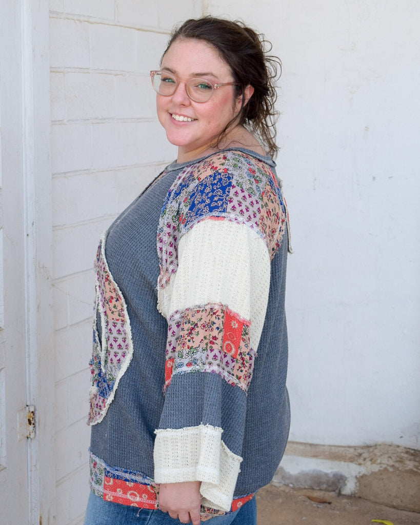 - Features: Long Sleeve, Oversized relaxed Fit, Crew neckline, Quilted "peace sign" design, Patchwork sleeves, Grey material is a cozy waffle knit.