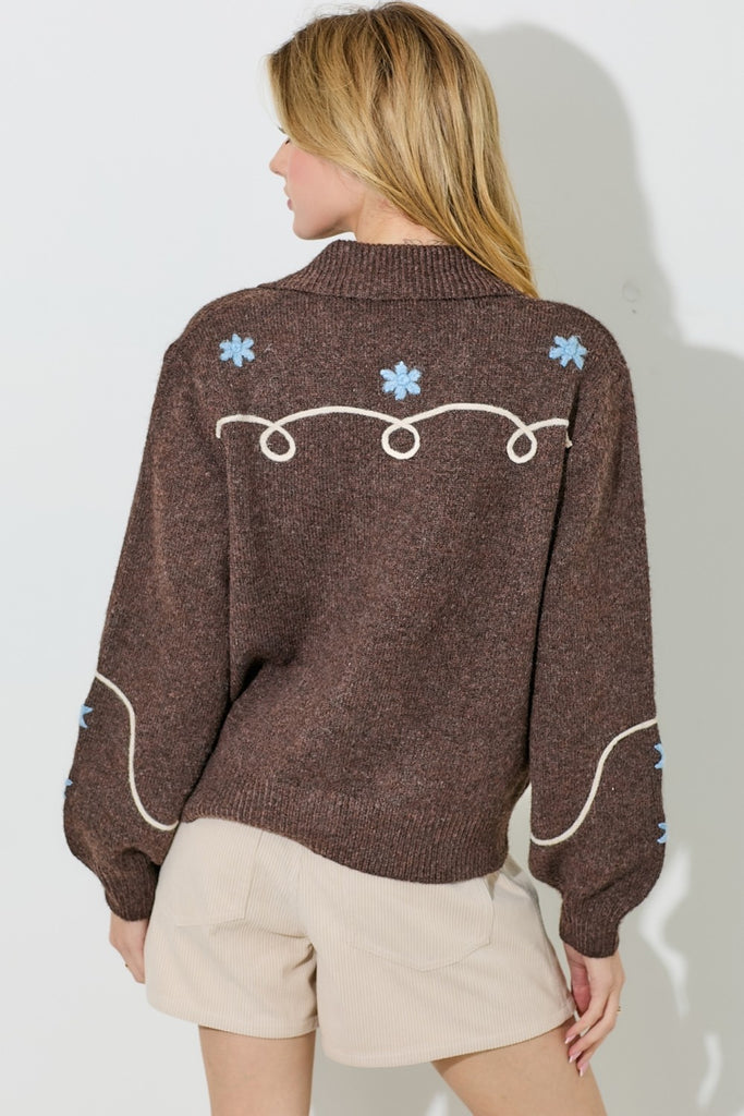 - Features: Long Sleeve knit sweater, Collared, Button down front, Western Embroidery detailing, Soft and cozy.