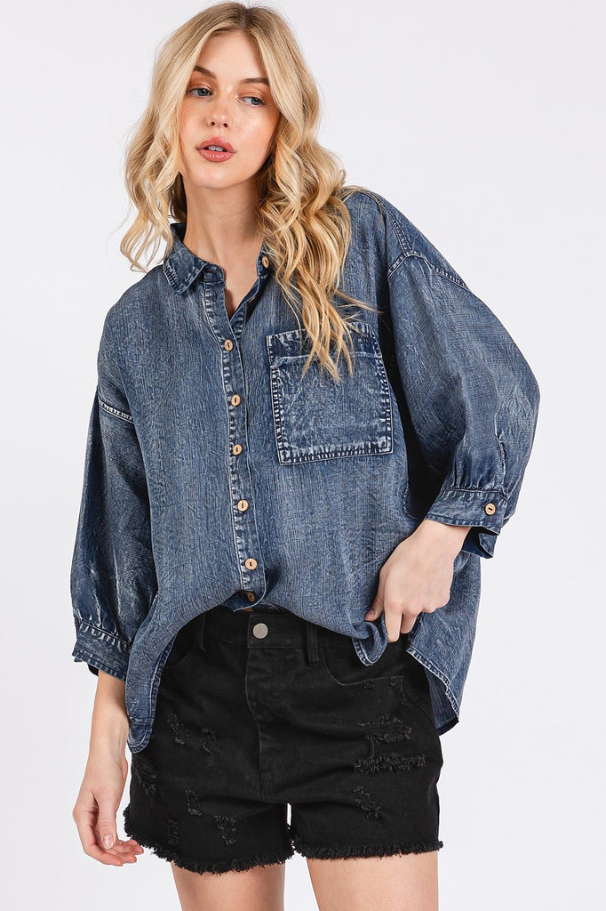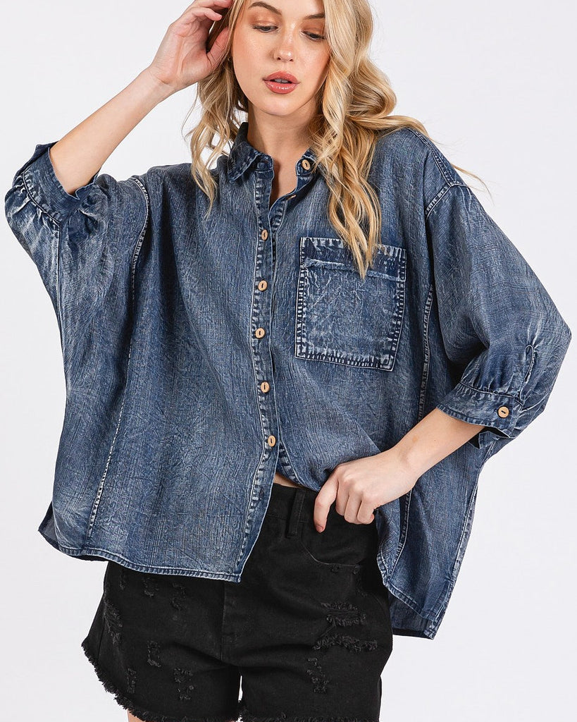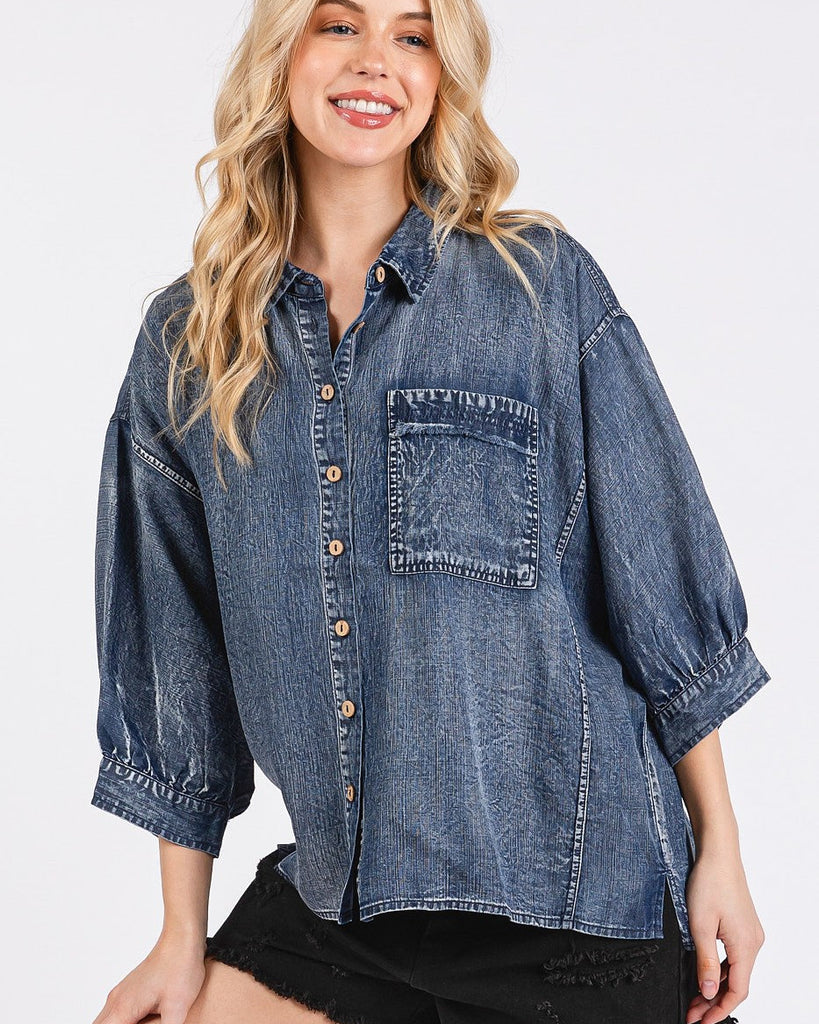 - Features; Washed tencel chambray fabric, Button down front, Chest pocket,3/4 sleeve with buttoned cuff, Doman sleeve Drop shoulder, Sid slit, Boxy fit.