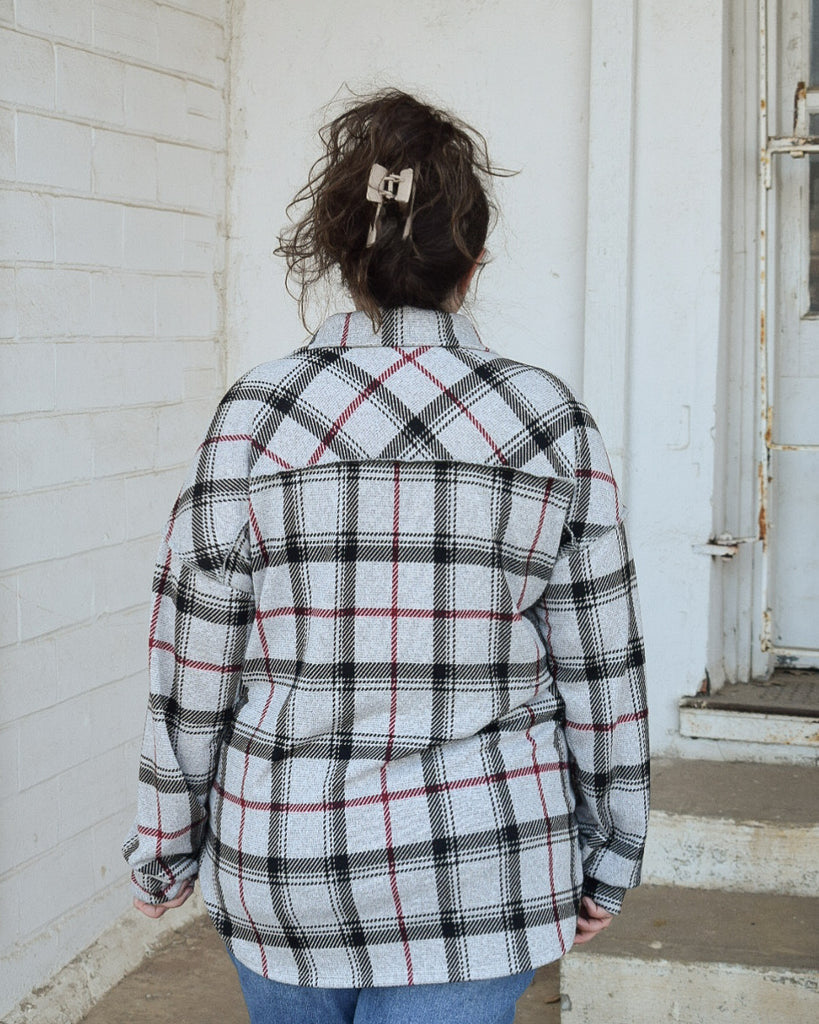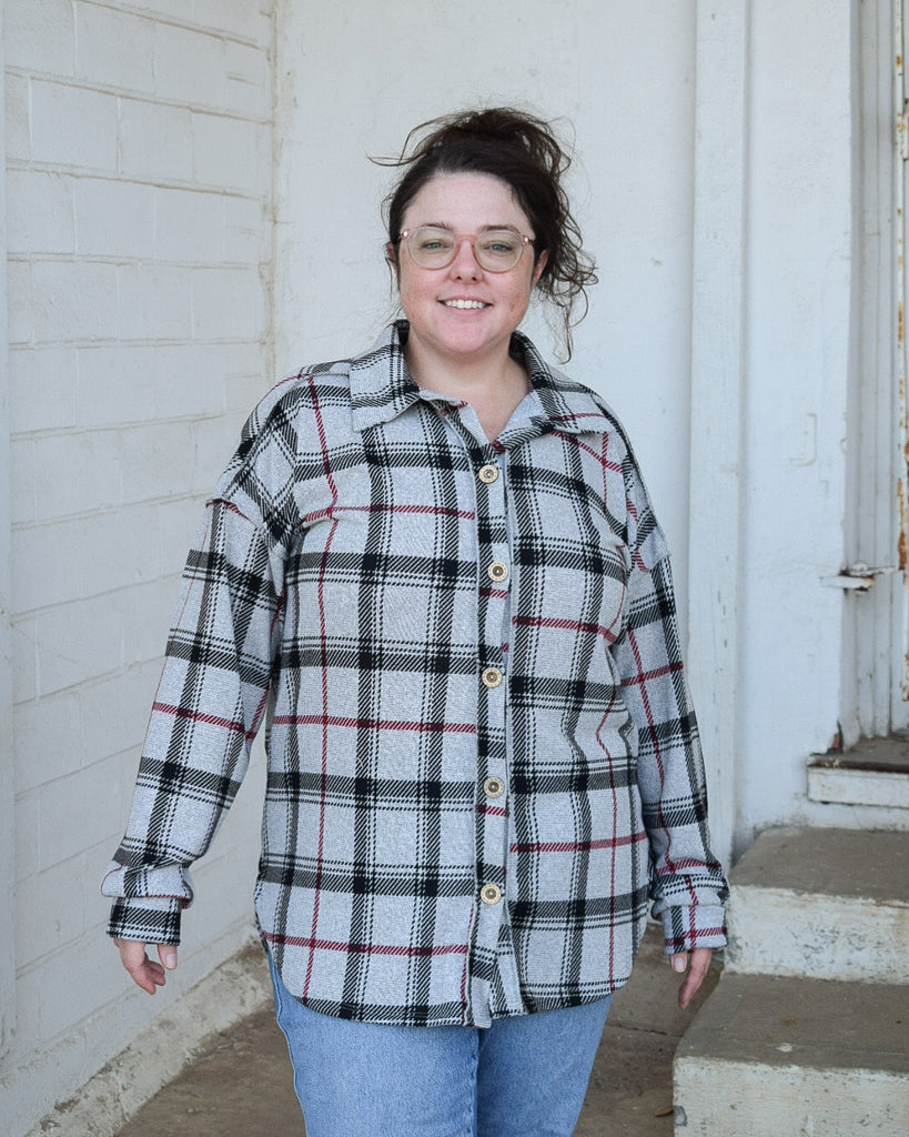 • Features:  Long Sleeve, Front button up, Collared, Plaid knit fabric, Curved Hem.