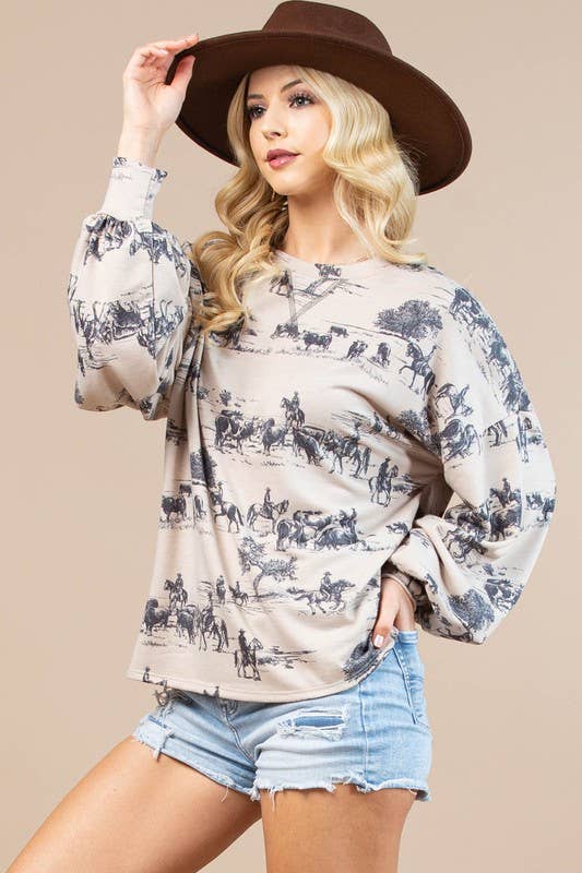 HAILEY WESTERN PRINT SWEATSHIRT - KHAKI/CHARCOAL