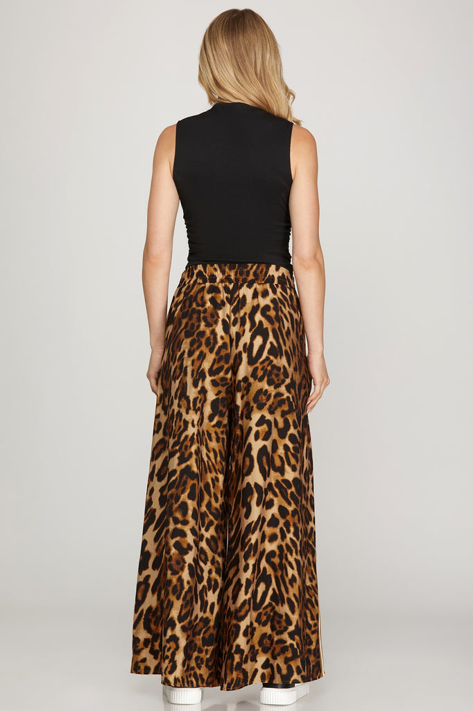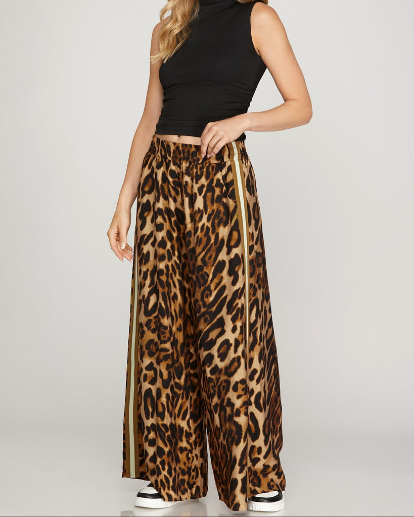 - Features: Wide leg, Non-stretch fabric, Leopard print, Elastic waist, Side pockets, Racer stripe side detail.