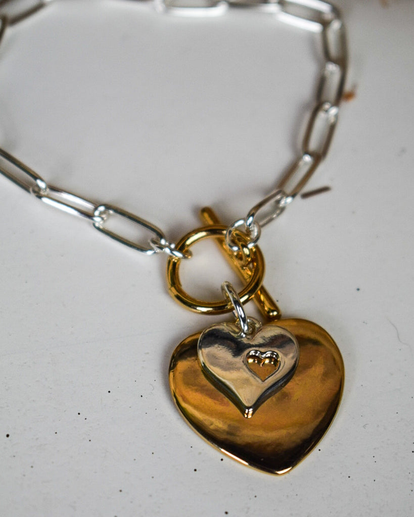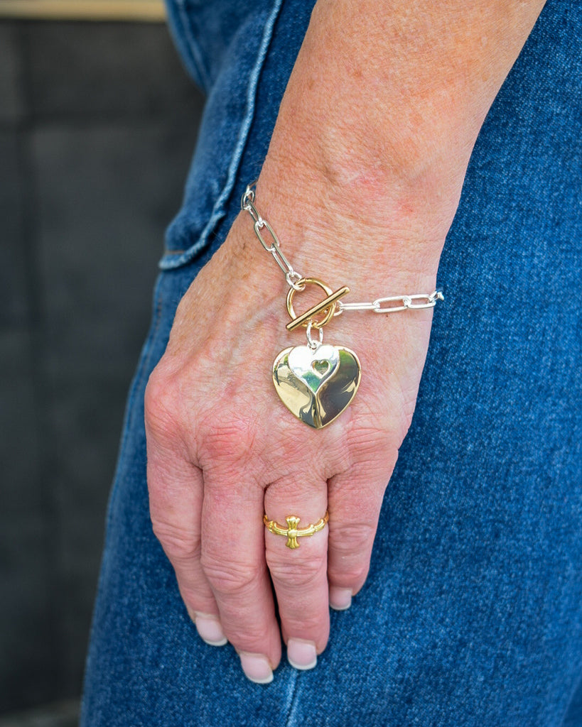 Add a playful touch to your style with the Double the Love Charm Bracelet. Featuring charming heart and key charms in silver and gold tones, this bracelet is perfect for unlocking smiles. The easy toggle closure ensures a comfortable fit, making it a delightful accessory to brighten any outfit.
