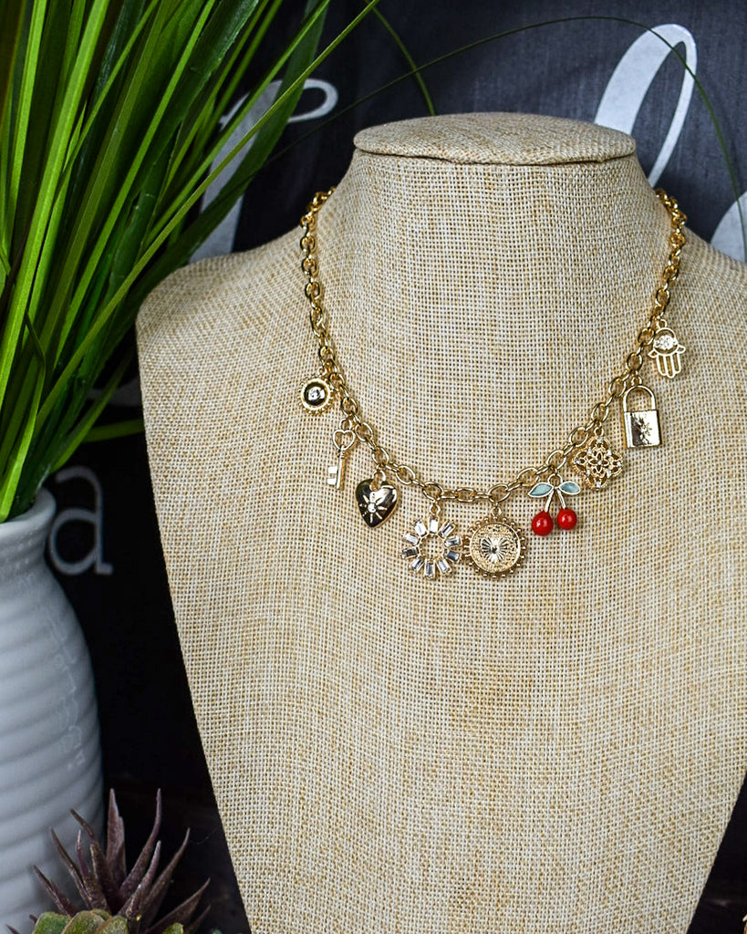 STARBURST AND CHERRIES CHARM NECKLACE - GOLD