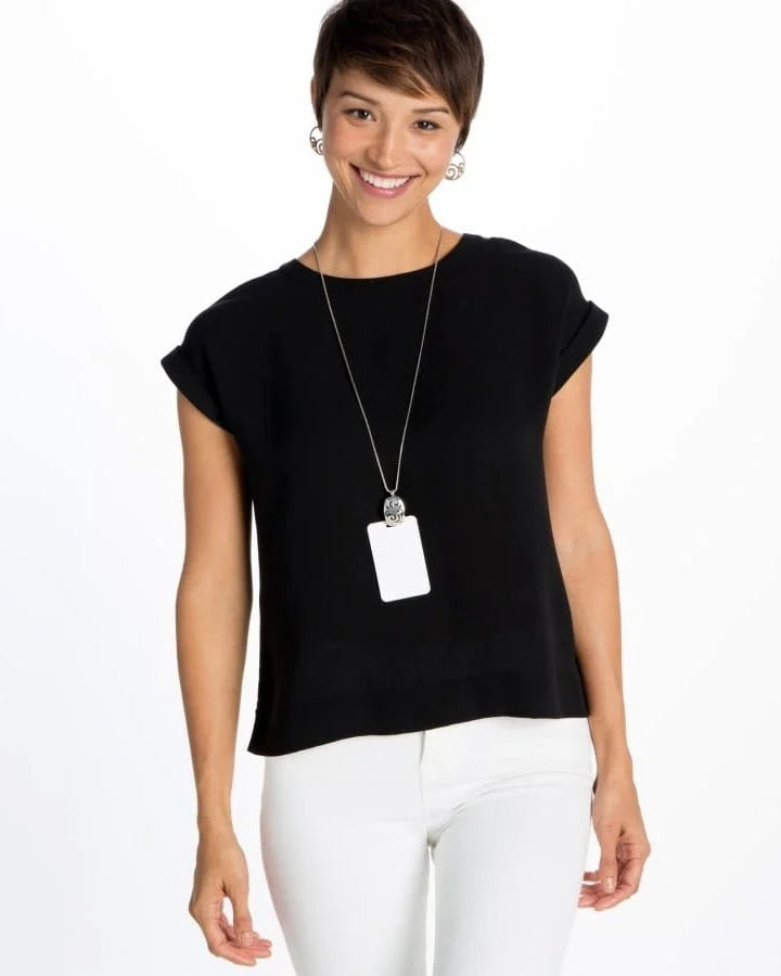 Inspired by 1960s Swinging London fashion and today's hip jewelry silhouettes, this badge clip is both an ID holder and a hip style statement.