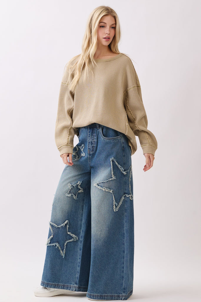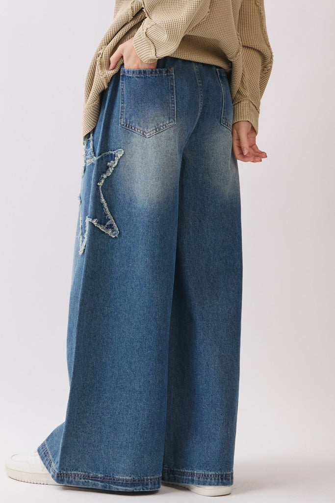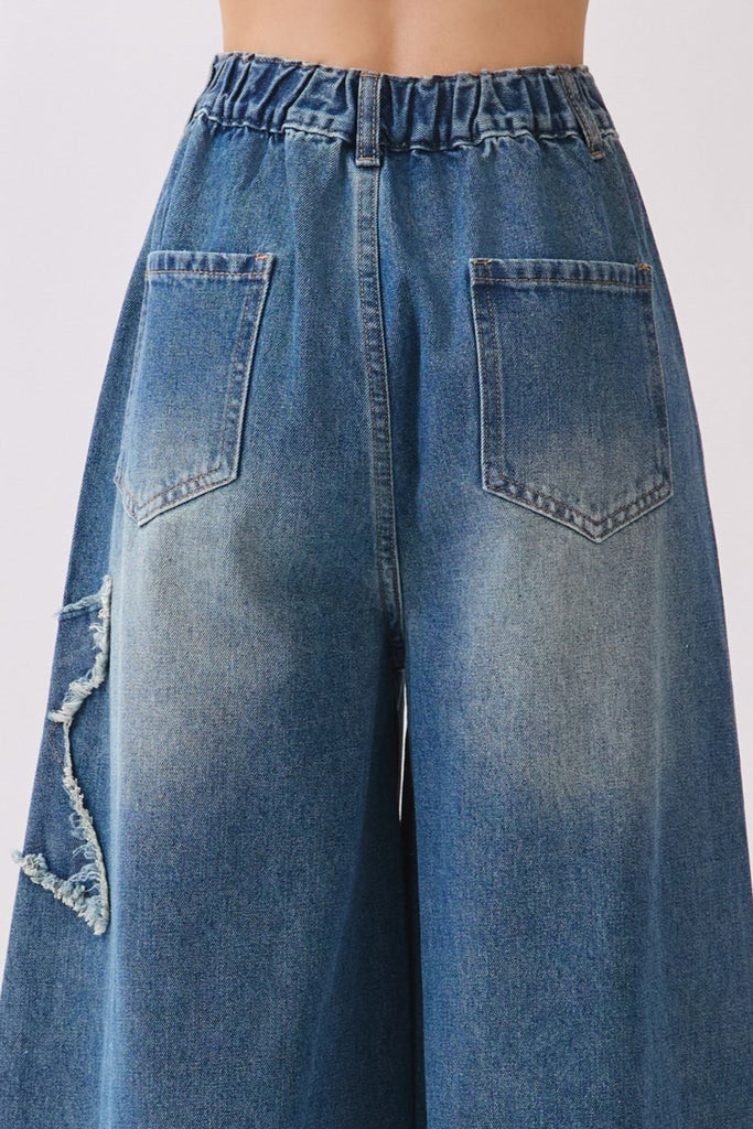 • Features:  High rise, Ultra wide leg, Elastic back waistband, Medium wash denim, Frayed star shape appliques, Large patch pocket on back, Gentle fading for a vintage look, Relaxed, Oversized.