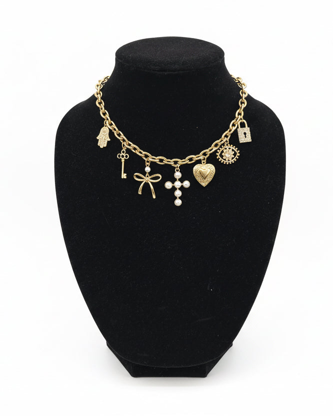 - Pearl cross, Bling padlock, Evil eye, Bow, Heart locket, Key, Bling Hamsa