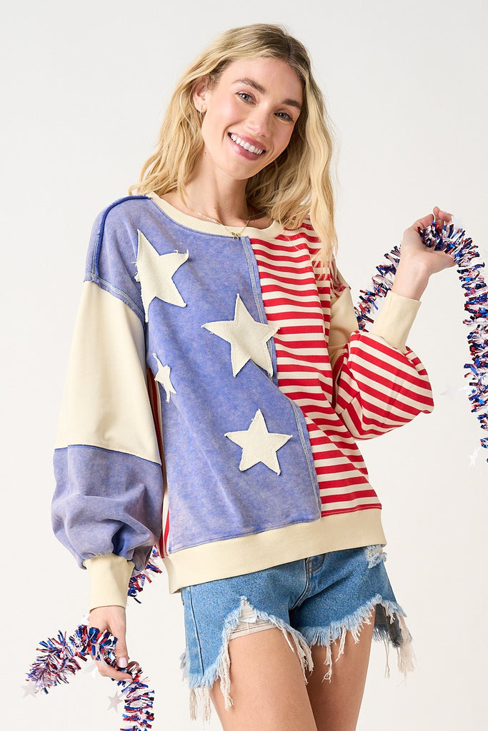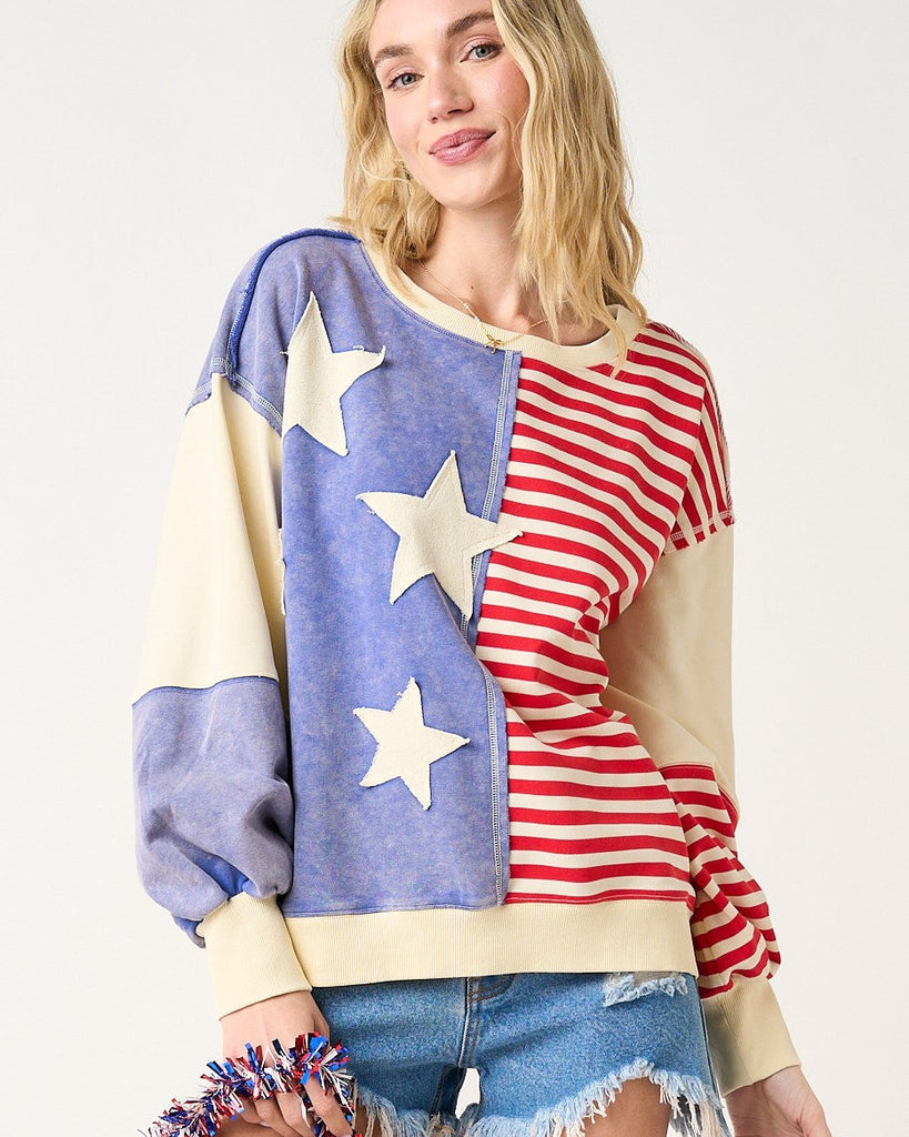 Make a statement in the most stylish way possible with the American Flag Patchwork Color-Block Sweatshirt. Crafted from mineral-washed cotton French terry knit, this oversized sweatshirt features bold American flag patchwork, star patches, and striped print — a standout Americana piece perfect for 4th of July, Memorial Day, or everyday patriotic style.