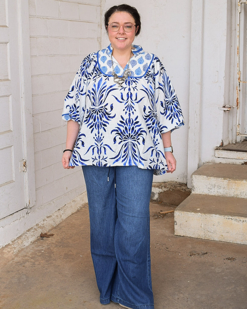 ANGELA BLUE MIX PRINTED BLOUSE - CURVY