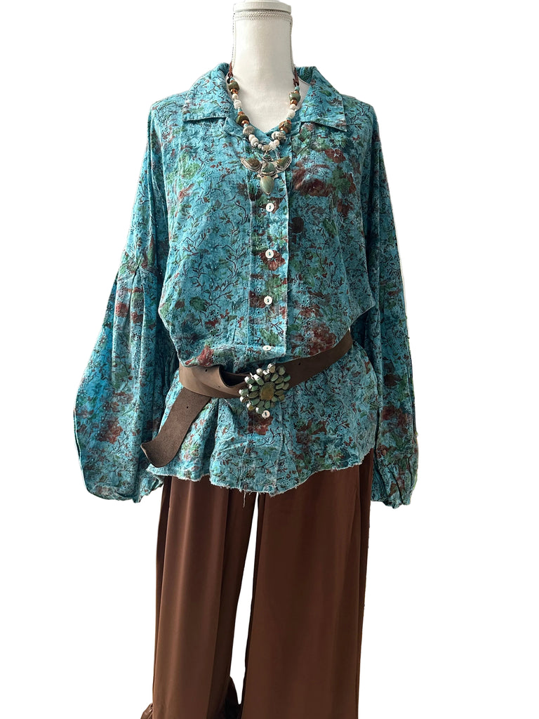 - Feature: Boho, shabby chic style, Button front, Long balloon sleeve, Oversized, Printed eyelet fabric,