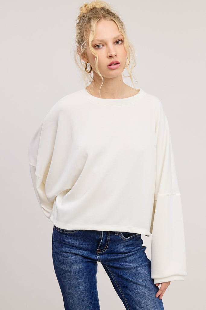 - Features: Cropped, Long sleeve, Gathered cuff, Dropped shoulder, Comfy scuba fabric.