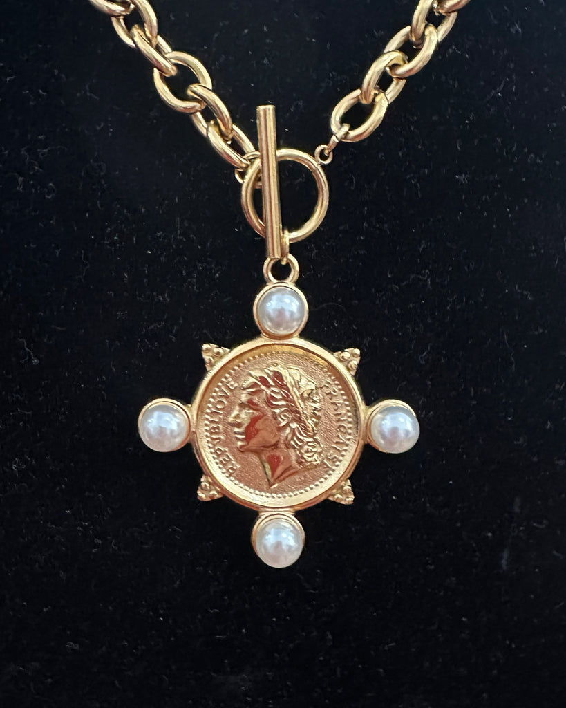 FRENCH COIN MEDALLION 18K GOLD PLATE WATERPROOF NON-TARNISH NECKLACE- GOLD