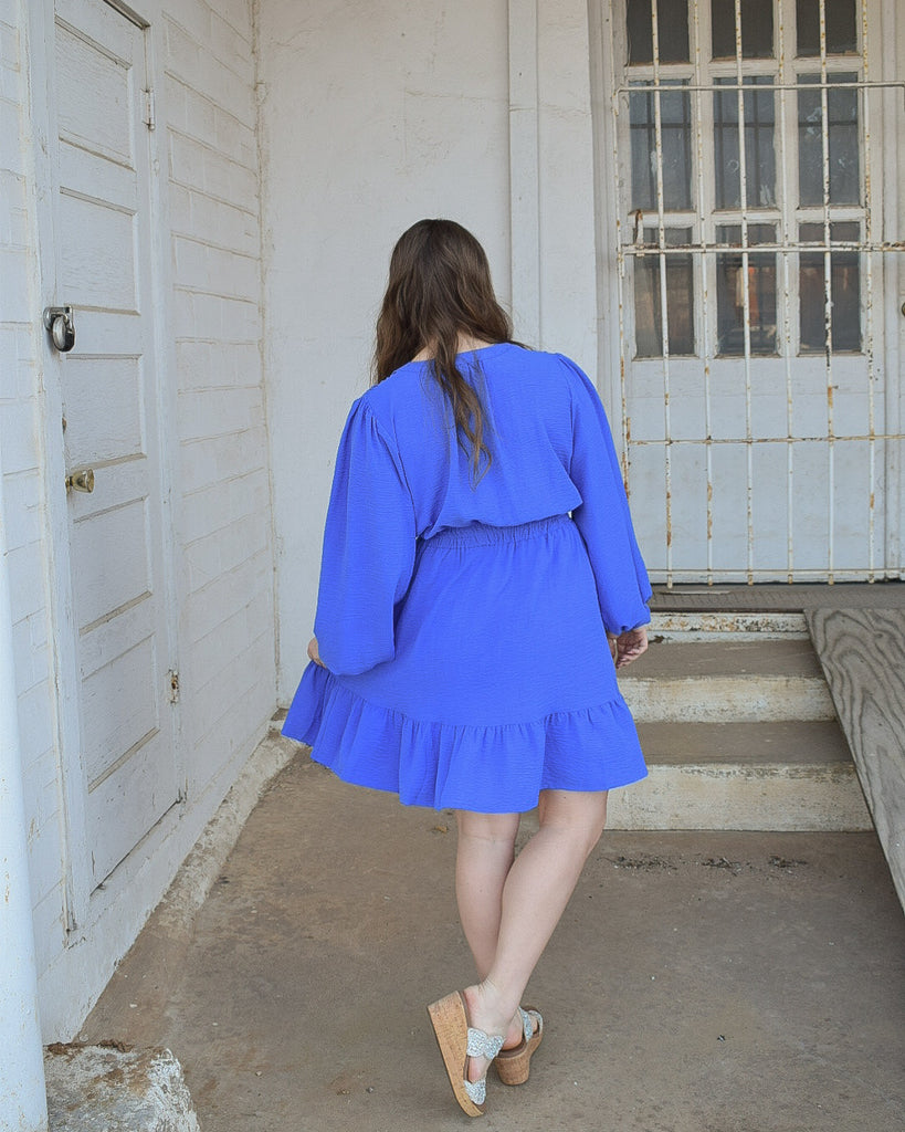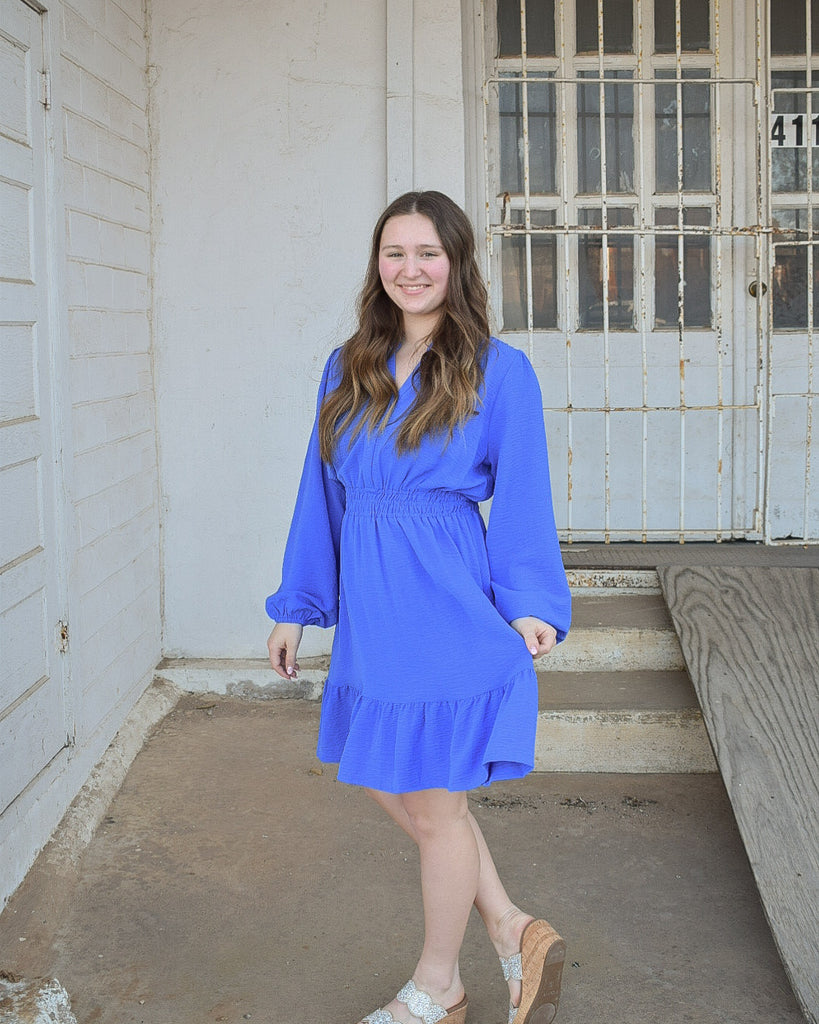 Meet the Julia Dress—your new go-to for every occasion that calls for effortless elegance. Whether you're walking down the aisle as a guest, celebrating at an upcoming event, or simply wanting to feel fabulous, this royal blue stunner delivers. Long sleeves and a gathered wrist add a touch of sophistication, while the elastic waistband keeps you comfortable all day (and night). The ruffled bottom brings playful movement, and those hidden side pockets?