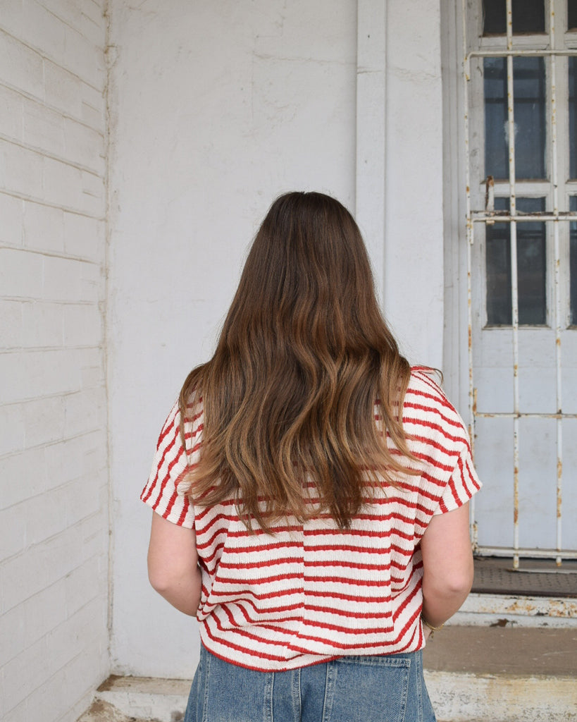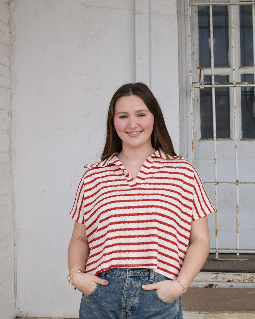 Stay effortlessly chic in this striped essential. The short-sleeved collared top features a flattering split neckline and bold red stripes that pair with everything in your wardrobe. Crafted from a breathable cotton-blend with just enough stretch, it moves with you all day. The oversized fit is intentionally relaxed—size down for a more tailored look.