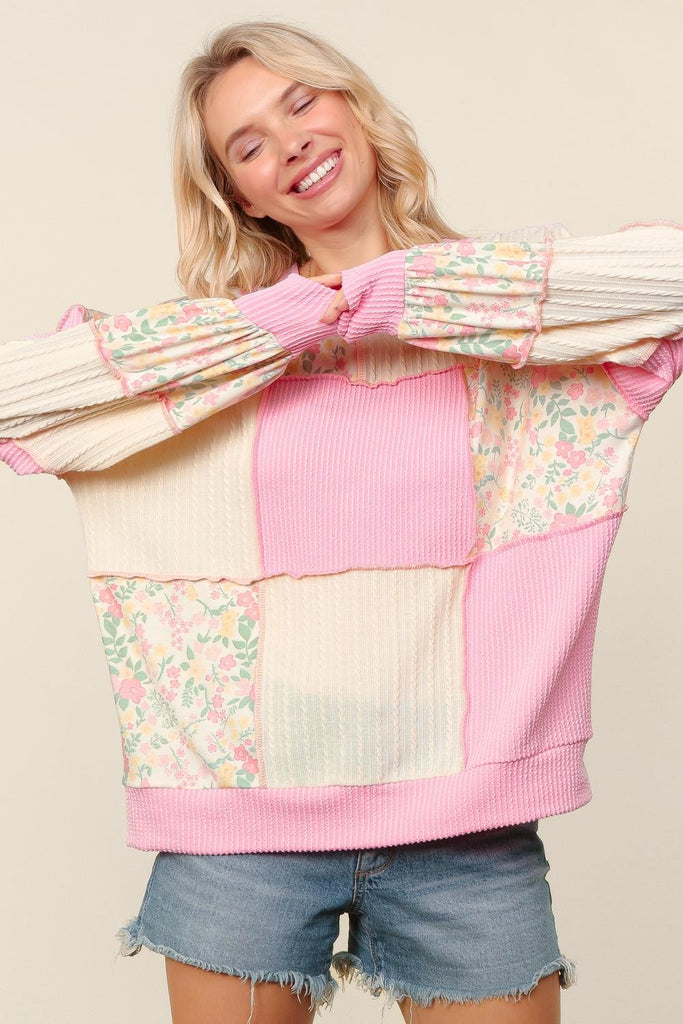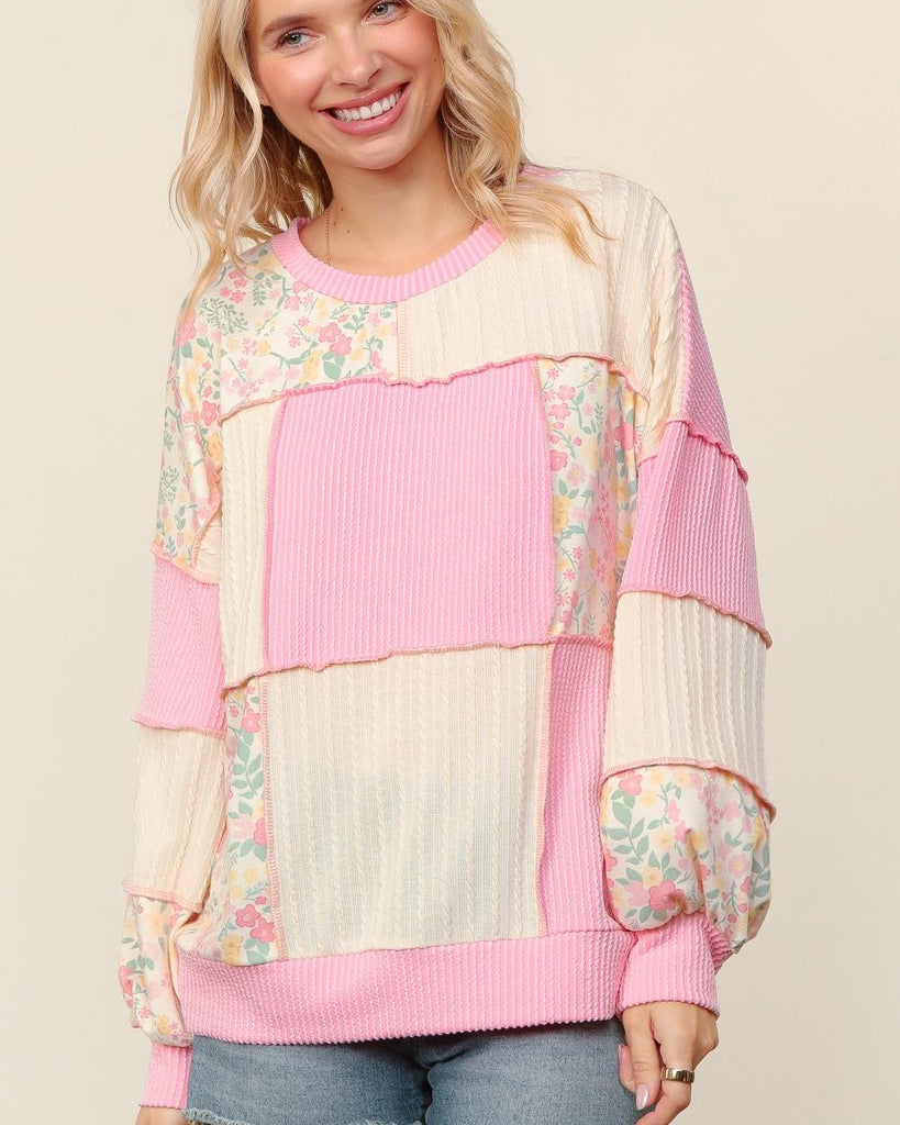 - Relaxed/oversized fit, long sleeves, rib cable knit texture, color blocking and floral patchwork