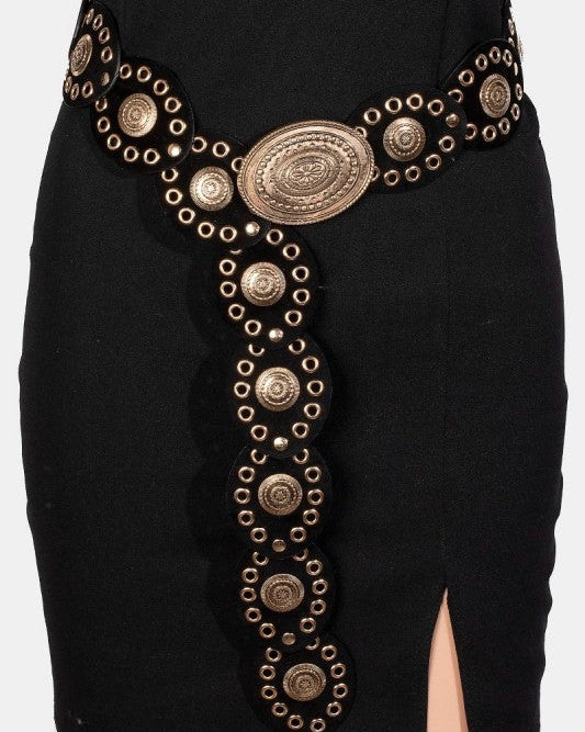 Make a statement with this show-stopping oval belt that brings Western vibes to any outfit. Featuring a bold, ornate disc buckle that commands attention, this faux leather stunner blends timeless cowboy charm with modern edge. Available in two versatile colors, it's the perfect accessory to cinch your waist and elevate your look from basic to bold. Whether you're dressing up or keeping it casual, this belt adds that touch of personality that says you've got style for days..