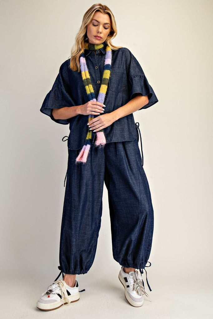 Effortless style meets comfort in this washed denim top by Easel. Featuring a collared neckline, short ruffled sleeves, and a boxy oversized fit, it's designed for all-day wear. Button-down front with a chest pocket and adjustable drawstring sides for a customizable silhouette. The soft cotton-blend fabric (75% cotton, 25% polyester) keeps you cool and comfortable..