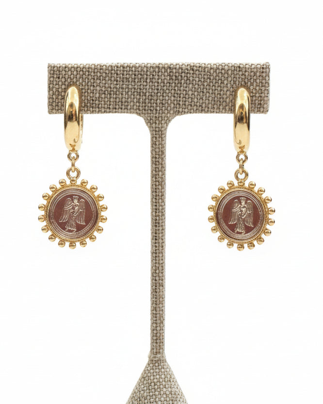 Elevate your everyday look with these striking Roman coin hoop dangle earrings. Featuring a chunky gold hoop paired with an antique coin charm, they blend boho-inspired aesthetics with timeless elegance. The mixed gold and silver tone finish adds versatility, making them perfect for layering or wearing solo. Secure post back closure ensures comfortable all-day wear. A statement piece that effortlessly transitions from casual to sophisticated.