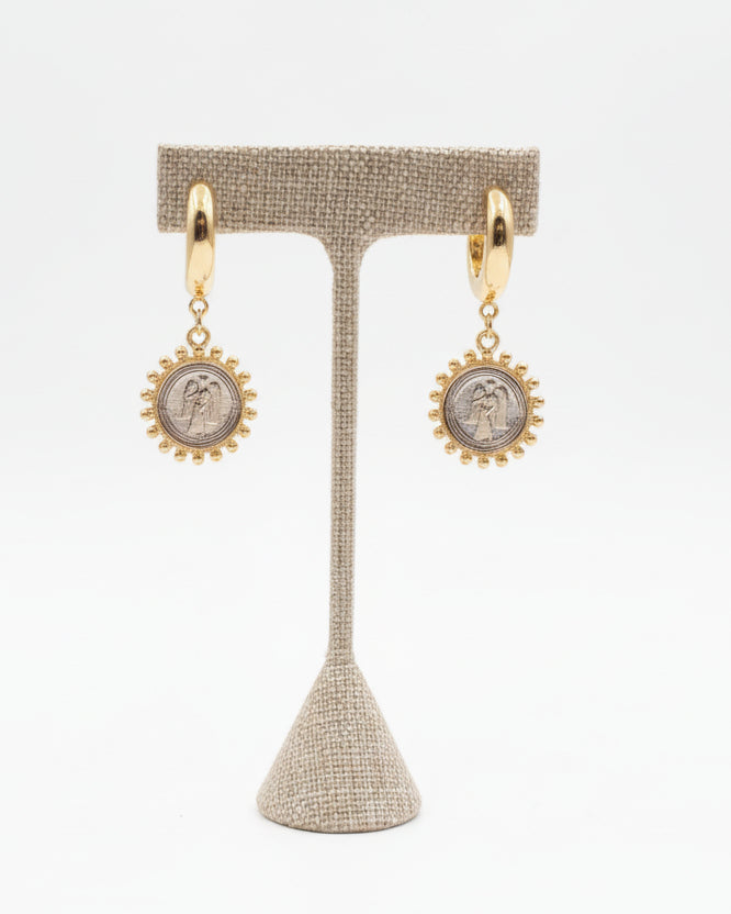 ROMAN COIN HOOP DANGLE EARRINGS- GOLD AND SILVER TONE