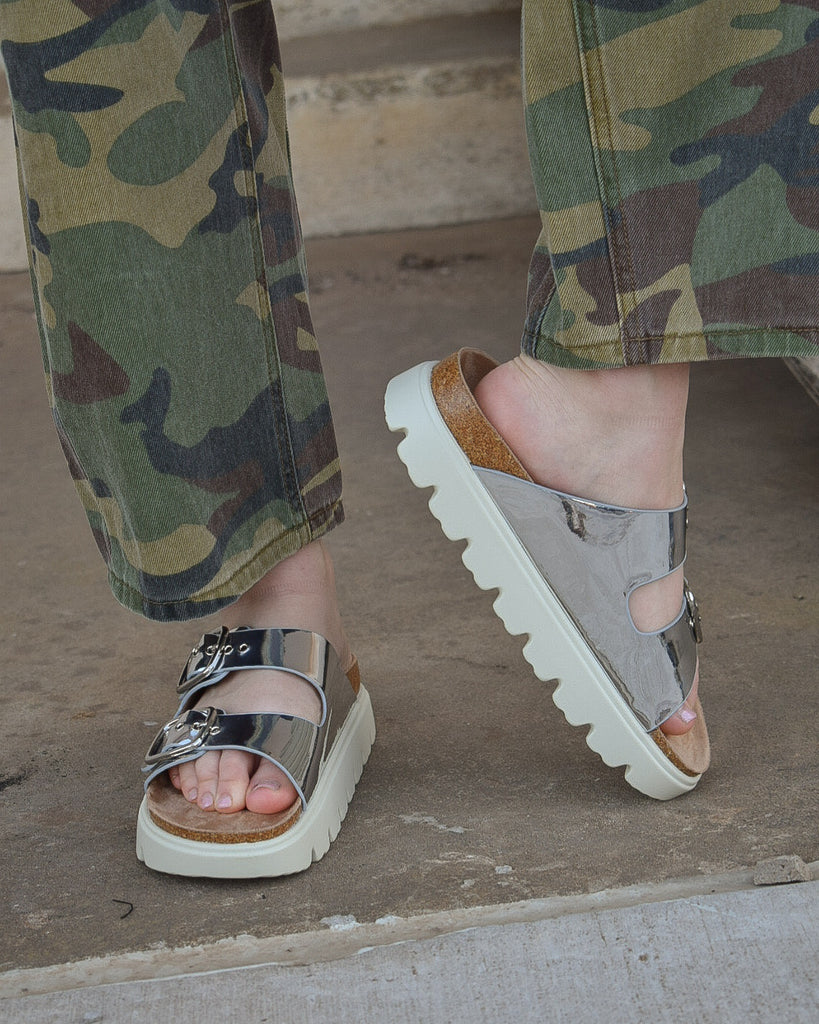 Slip into the spotlight with the RUMOR HAS IT- SILVER METALLIC BY CORKYS! This show-stopping shoe brings the glam with its eye-catching metallic finish. Designed for comfort and style, it features an easy slip-on entry with an adjustable strap to keep you secure all day long. The cushioned sole means you can strut your stuff without the ouch, while the 1-inch heel and 0.75-inch platform give you just the right lift. Available in sizes 7-11 and true to size (size up if you're between sizes). Shipped box-free to keep costs down. Get ready to turn heads!