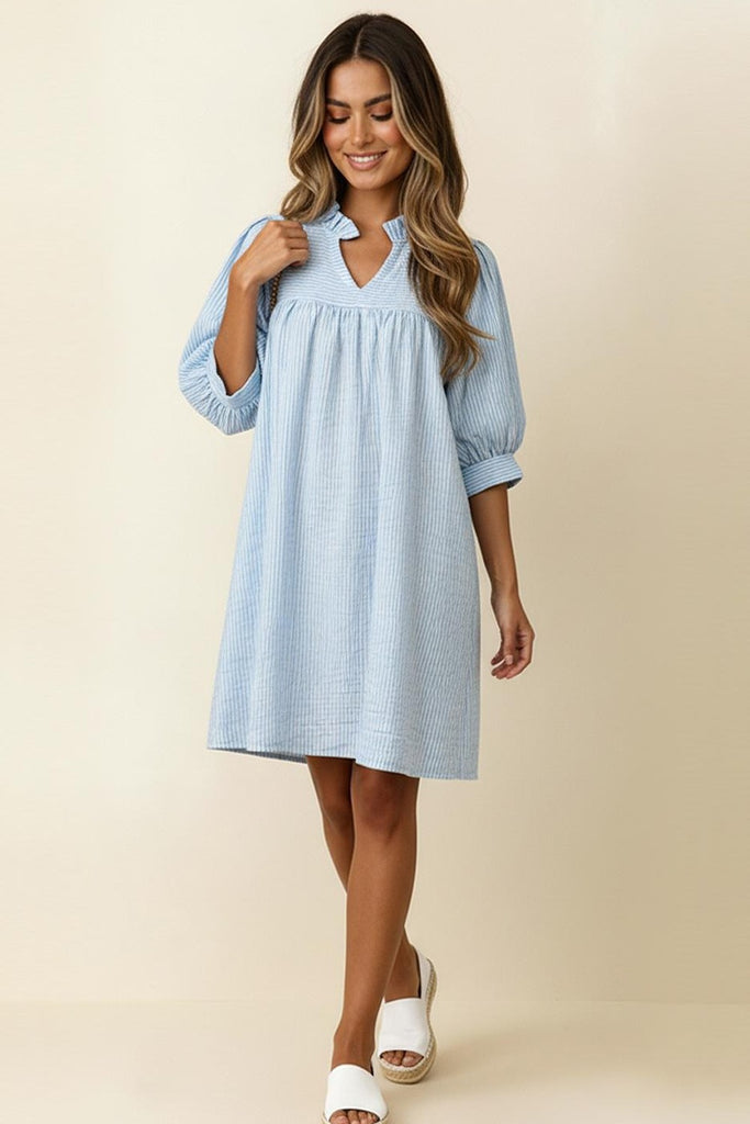 Effortlessly chic meets fun in this playful shift dress! Featuring a flirty frilled notch neckline and charming yoke bubble detail, it's designed for easy, breezy wear. The crisp pinstripe pattern adds timeless sophistication while short sleeves keep things light and airy. Perfect for casual outings or dressed-up occasions, this versatile piece transitions seamlessly from day to night. Slip it on and feel instantly put-together!