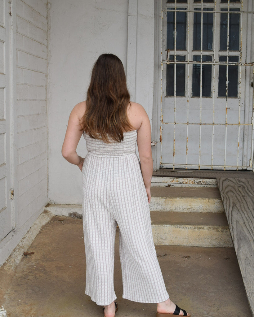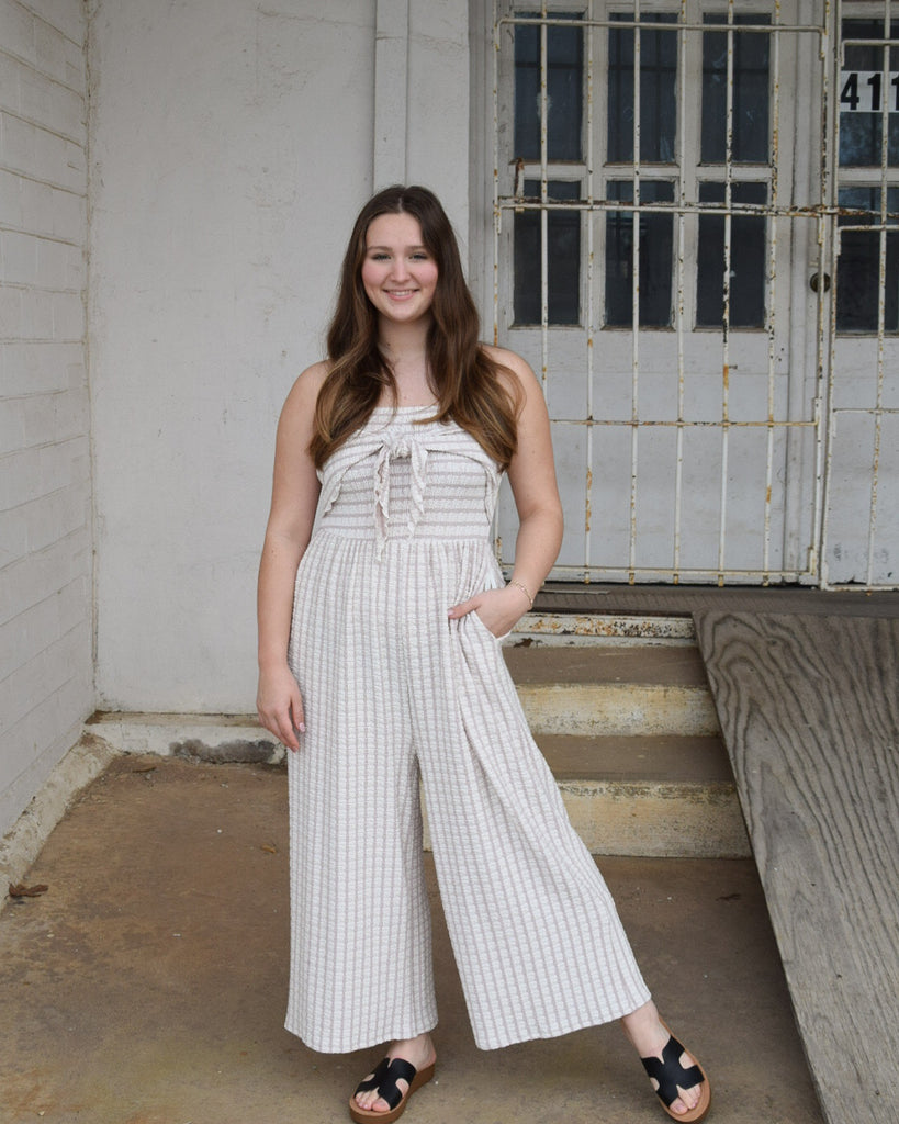 Designed with an effortless strapless silhouette, this striped jumpsuit is crafted from a soft, stretchy fabric with subtle texture for added dimension and comfort. The softly structured bodice features a front tie detail that creates gentle shape, while the pull-on design allows for easy on-and-off wear. Finished with a relaxed wide-leg cut, this one-and-done piece moves beautifully and transitions seamlessly from casual daytime looks to elevated evenings.