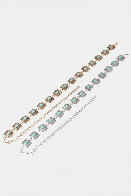 Saddle up for serious style with this Western Square Concho Belt—where turquoise meets timeless charm. Available in gleaming gold or silver, this chain beauty strikes the perfect balance between understated elegance and eye-catching flair. Whether you're channeling your inner cowgirl or just want to add a touch of southwestern swagger to your everyday look, this belt delivers the goods. Layer it, cinch it, or let it hang loose—either way, you're guaranteed to turn heads.